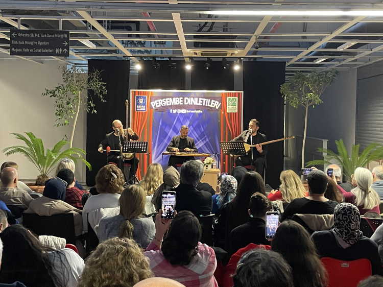 Bursa Büyükşehir Belediyesi Orkestra Şube Müdürlüğü tarafından geleneksel hale getirilecek olan ‘Perşembe Dinletileri’ konserlerinin ilki, Merinos Orkestra Şube Müdürlüğü yerleşkesinde düzenlendi. Sanatseverlerin yoğun ilgi gösterdiği konserde, kanun sanatçısı Ali Çalanlı, tambur sanatçısı Ömer Göktepeliler ve saz sanatçısı Selçuk Oruç seslendirdikleri eserlerle dinleyenlere müzik ziyafeti yaşattı.