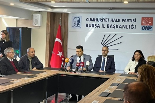 BBP Genel Başkanı Mustafa Destici'nin Balkanlar'dan göçen vatandaşları hedef alan ifadeleriyle ilgili olarak, CHP Bursa 2. Bölge Milletvekili adayı Hasan Öztürk, CHP Bursa İl Başkanlığı'nda basın açıklaması yapıyor.