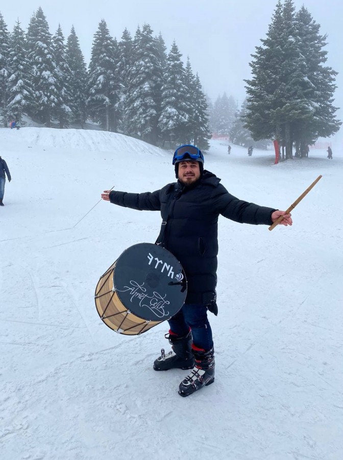 Tekirdağ'da davul virtüözü Ahmet Çelik, davuluyla çılgın çalışmalara imza atmaya devam ediyor. Daha önce denizin altında, yamaç paraşütü ile 2 bin metrede ve yeni doğan bebeğin başında davul çalan Çelik, bu sefer de Bursa Uludağ'da kayak yaparken, davul çalarak çılgınca bir çalışmaya daha imza attı. Çelik'in davul çaldığı anlar sosyal medyadaki vatandaşlar tarafından büyük bir ilgiyle izleniyor.