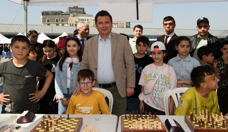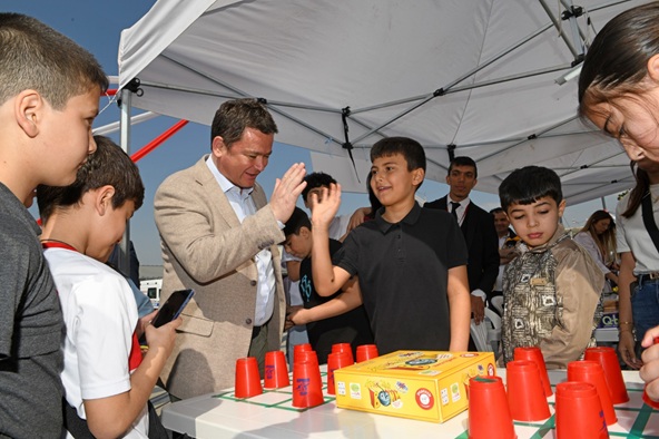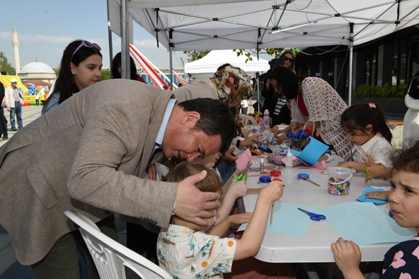 Başkan Aydın, çocuklarla birlikte bol bol fotoğraf çektirerek meydandaki şenlik alanını gezdi.