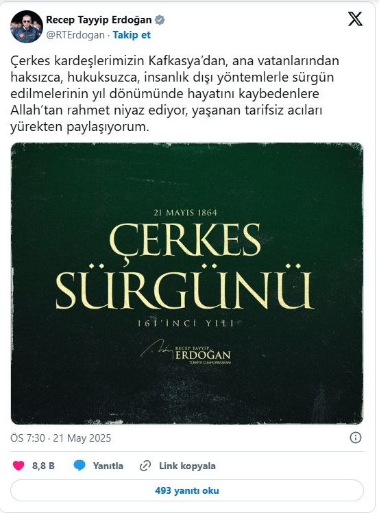 Çerkes kardeşlerimizin Kafkasya'dan, ana vatanlarından haksızca, hukuksuzca, insanlık dışı yöntemlerle sürgün edilmelerinin yıl dönümünde hayatını kaybedenlere Allah'tan rahmet niyaz ediyor, yaşanan tarifsiz acıları yürekten paylaşıyorum.