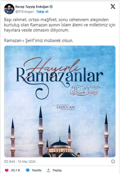 Twitter hesabından paylaşım yapan Cumhurbaşkanı Erdoğan, "Başı rahmet, ortası mağfiret, sonu cehennem ateşinden kurtuluş olan Ramazan ayının İslam âlemi ve milletimiz için hayırlara vesile olmasını diliyorum. Ramazan-ı Şerif'imiz mübarek olsun" dedi.