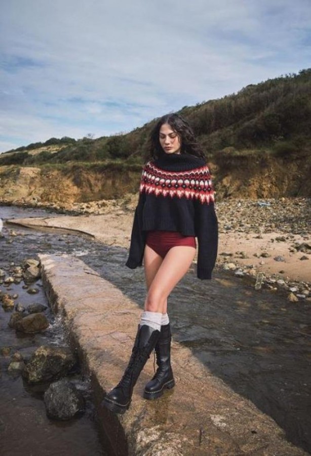 Kazağını çizme ile kombinleyen Demet Özdemir'e "Altına bir şey giymeyi unutmuşsun", "Çok güzelsin", "Kazak altına saçma seçim", "Çok coolsun" yorumları geldi.