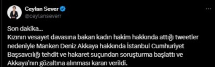 Gazeteci Ceylan Sever sosyal medya hesabından, Deniz Akkaya hakkında İstanbul Cumhuriyet Başsavcılığı tarafından soruşturma başlatıldığını ve Akkaya'nın gözaltına alınmasına karar verildiğini açıkladı.