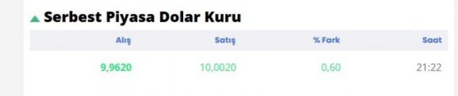 Saat 21:25 itibarıyla dolar 10,01'den, altının gram fiyatı ise 600 liradan işlem görüyor. Aynı dakikalarda euro 11,46'dan, sterlin ise 13,43'ten alıcı buluyor. Çeyrek altın 992,24 liradan, cumhuriyet altını 4.041 liradan satılıyor.