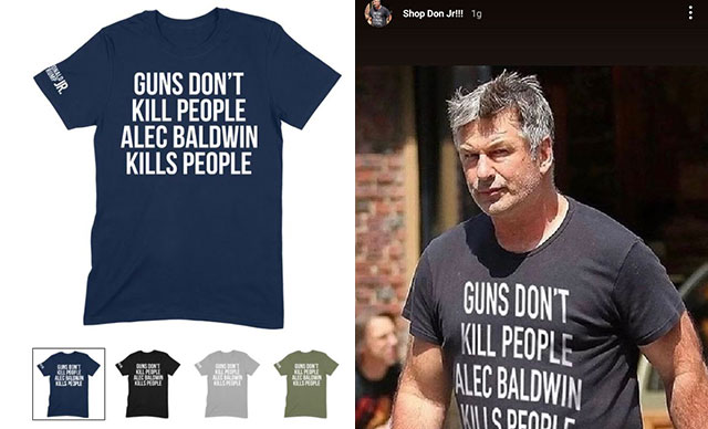 Eski ABD Başkanı Donald Trump’ın oğlu Donald Trump Jr’ın sahip olduğu online mağazada, ünlü aktör Alec Baldwin’in kazayla film setinde görüntü yönetmenini öldürmesinin ardından konuyla ilgili üzerinde “Silahlar insanları öldürmez. Alec Baldwin insanları öldürür” yazan tişörtler satılmaya başlandı.