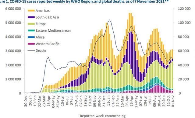 DSÖ Covid-19 haftalık raporunda dünya geneli ve bölgelere ilişkin detaylı verilere yer verildi. Raporda, “Dünya genelinde 1-7 Kasım 2021 haftasında, vakalarda yüzde 1 artış gözlemlendi ve 3,1 milyonun biraz üzerinde yeni vaka bildirildi. DSÖ Avrupa Bölgesi, bir önceki haftaya kıyasla yeni haftalık vakalarda yüzde 7'lik bir artış bildirirken, diğer bölgeler düşüşler veya istikrarlı eğilimler raporladı. Benzer şekilde, Avrupa Bölgesi yeni ölümlerde yüzde 10'luk bir artış bildirirken, diğer bölgeler düşüş bildirdi. Küresel olarak, önceki haftaya göre yüzde 4'lük bir düşüşle 48 binden fazla yeni ölüm raporlandı” denildi.