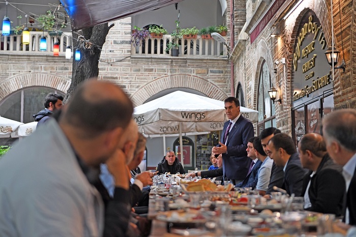 Tarihi çarşı esnafıyla Fidan Han’da düzenlenen kahvaltı programında bir araya gelen Başkan Dündar’a Bursa Tarihi Çarşı ve Hanlar Birliği Başkanı İsa Altıkardeş, bugüne kadar yapılan birçok yatırımla tarihi çarşının ihya edilmesinden dolayı teşekkür etti. Altıkardeş, “Mustafa Başkanımız, çarşı esnafına ne söz verdiyse hepsini fazlasıyla yerine getirdi. Başkanımız, çarşımıza ayrı bir önem veriyor ve bizi hiç yalnız bırakmıyor. Başkanımız ve ekibinin sayesinde tarihi çarşı eski hüviyetine kavuştu.” ifadelerini kullandı.