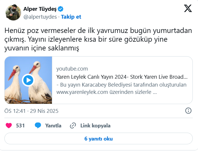 Müjdeyi veren fotoğraf sanatçısı Alper Tüydeş, sosyal medyadan yaptığı açıklamada, "Henüz poz vermeseler de ilk yavrumuz bugün yumurtadan çıkmış. Yayını izleyenlere kısa bir süre gözüküp yine yuvanın içine saklanmış." ifadelerini kullandı.