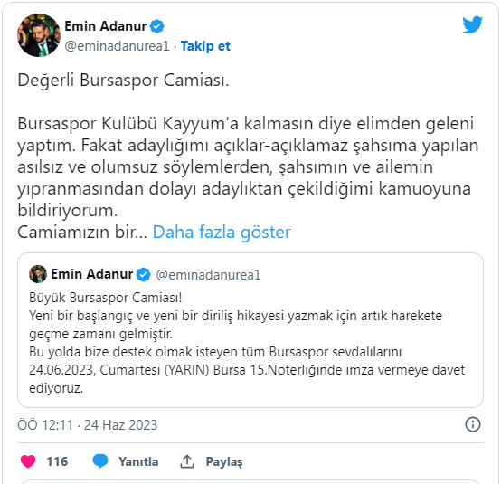 Değerli Bursaspor Camiası. Bursaspor Kulübü Kayyum'a kalmasın diye elimden geleni yaptım. Fakat adaylığımı açıklar-açıklamaz şahsıma yapılan asılsız ve olumsuz söylemlerden, şahsımın ve ailemin yıpranmasından dolayı adaylıktan çekildiğimi kamuoyuna bildiriyorum. Camiamızın bir ve beraber olduğu günlerde buluşmak dileğiyle..