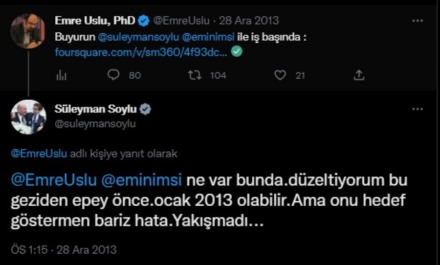 İçişleri Bakanı Soylu'nun 28 Aralık 2013 tarihinde şu an firari olarak aranan Emre Uslu ve "eminimsi" kullanıcılarıyla sosyal medya hesabından etkileşimi olduğu görüldü.