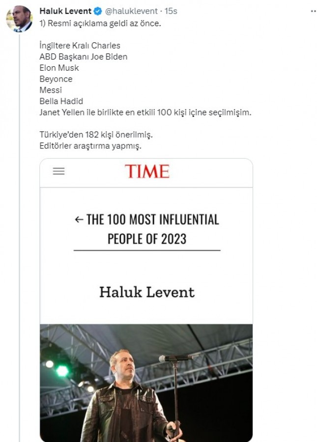 Levent, Time dergisinin "en etkili 100 kişisi" listesine girdiğini, "İngiltere Kralı Charles, ABD Başkanı Joe Biden, Elon Musk, Beyonce, Messi, Bella Hadid, Janet Yellen ile birlikte en etkili 100 kişi içine seçilmişim" sözleriyle duyurdu. Ancak ödülü reddettiğini ve ABD'ye gitmeyeceğini söyleyen ünlü isim, " Twitter'da dünya sıralamasındaki gücü. Görüntülenme ve etkileşim gücü. Üye sayısı. Ahbap'ın geçmişte ve son depremdeki çalışmalar. İçerik beni üzdü. Türkiye Cumhuriyeti devletinin benim çalışmalarım üzerinden eleştirilmesi kabul edeceğim bir husus. Bu sebeple ödülü reddediyorum ve Amerika'ya gitmeme kararı aldım. Deprem sürecinde tüm devlet kurumları, hükümet, tüm muhalefet, belediyeler ve 18 bin STK yani tüm ülke tek yürek olup herkes elinden geleni yapıyorken bu tartışmaların içine girmeme kararı aldım" dedi.