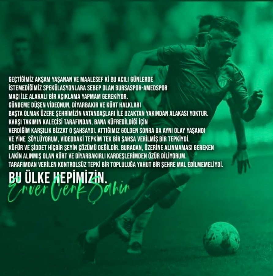 Gündeme düşen videonun, Diyarbakır ve kürt halkları başta olmak üzere şehrimizin vatandaşları ile uzaktan yakından alakası yoktur. karşı takımın kalecisi tarafından, bana küfredildiği için verdiğim karşılık bizzat o şahsaydı. attığımız golden sonra da aynı olay yaşandı ve yine söylüyorum, videodaki tepkim tek bir şahsa verilmiş bir tepkiydi.
