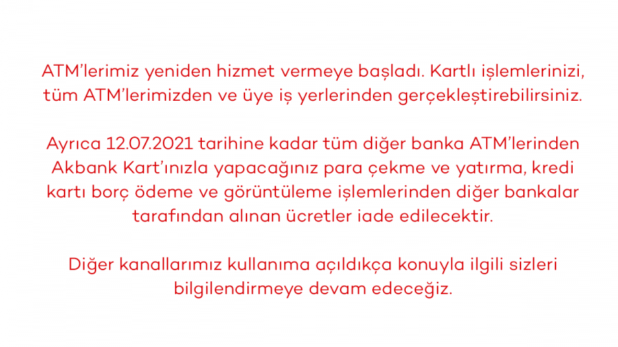 "ATM'lerimiz yeniden hizmet vermeye başladı. Kartlı işlemlerinizi, tüm ATM'lerimizden ve üye iş yerlerinden gerçekleştirebilirsiniz. Ayrıca 12.07.2021 tarihine kadar tüm diğer banka ATM'lerinden Akbank Kart'ınızla yapacağınız para çekme ve yatırma, kredi kartı borç ödeme ve görüntüleme işlemlerinden diğer bankalar tarafından alınan ücretler iade edilecektir. Diğer kanallarımız kullanıma açıldıkça konuyla ilgili sizleri bilgilendirmeye devam edeceğiz."