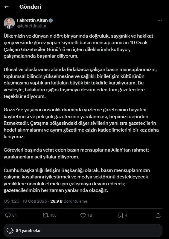 Cumhurbaşkanlığı İletişim Başkanı Fahrettin Altun, 10 Ocak Çalışan Gazeteciler Günü dolayısıyla sosyal medya hesabından açıklama yaptı.
