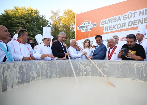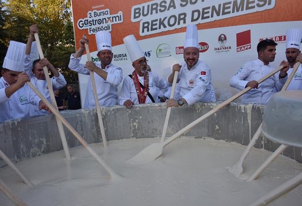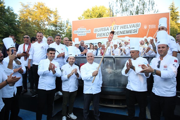 Bursa Aşçılar Derneği’nin katkılarıyla Merinos Parkı’nda Bursa’nın coğrafi işaretli tatlısı olan ‘Süt Helvası’ ile rekor denemesi gerçekleştirildi. Türkiye’nin farklı kentlerinden Bursa’ya gelen 150 civarında şef, devasa kazanın başına geçerek tek seferde 5 ton süt helvasını yapmak için çalıştı. Kazanın altındaki ateşi yakan Bursa Büyükşehir Belediye Başkanı Mustafa Bozbey, eşi Seden Bozbey ile birlikte kazanın başına geçerek dev tahta kepçelerle süt helvasını karıştırdı. İlk tadımı eşi Seden Bozbey ile birlikte yapan Başkan Mustafa Bozbey, daha sonra alanı dolduran misafirlere ikramda bulundu. Rekor denemesinde emeği geçen tüm şefleri tebrik eden Başkan Bozbey, “Şeflerimiz, bu sene 5 son süt helvası yaptı. Önümüzdeki senelerde daha fazlasını yapacaklardır. Bursa’nın coğrafi işaretli tatlısı olan süt helvası, mutlaka Guinness Rekorlar Kitabı’nda yer almalıdır. Dev kazanda yapılan süt helvasını Merinos Parkı’nda ve Kent Meydanı’nda 20 bin kişiye ikram edeceğiz” dedi.
