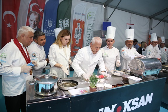 Başkan Mustafa Bozbey, daha sonra yerel şef aşçıların eşliğinde Bursa yemeği yapmak üzere tezgahın başına geçti. Bursa Aşçılar Derneği’nin katkılarıyla düzenlenen programda, Başkan Bozbey, Vali Yardımcısı Rıza Gençoğlu, CHP İl Başkanı Nihat Yeşiltaş ve Büyükşehir Belediyesi bürokratları Bursa’nın coğrafi işaretli lezzetlerini yapmak için yeteneklerini sergiledi. Eşi Seden Bozbey ile birlikte mutfaktaki hünerlerini de gösteren Başkan Bozbey, izleyenlerden büyük alkış aldı. Yapılan yemekler, daha sonra misafirlere ikram edildi.