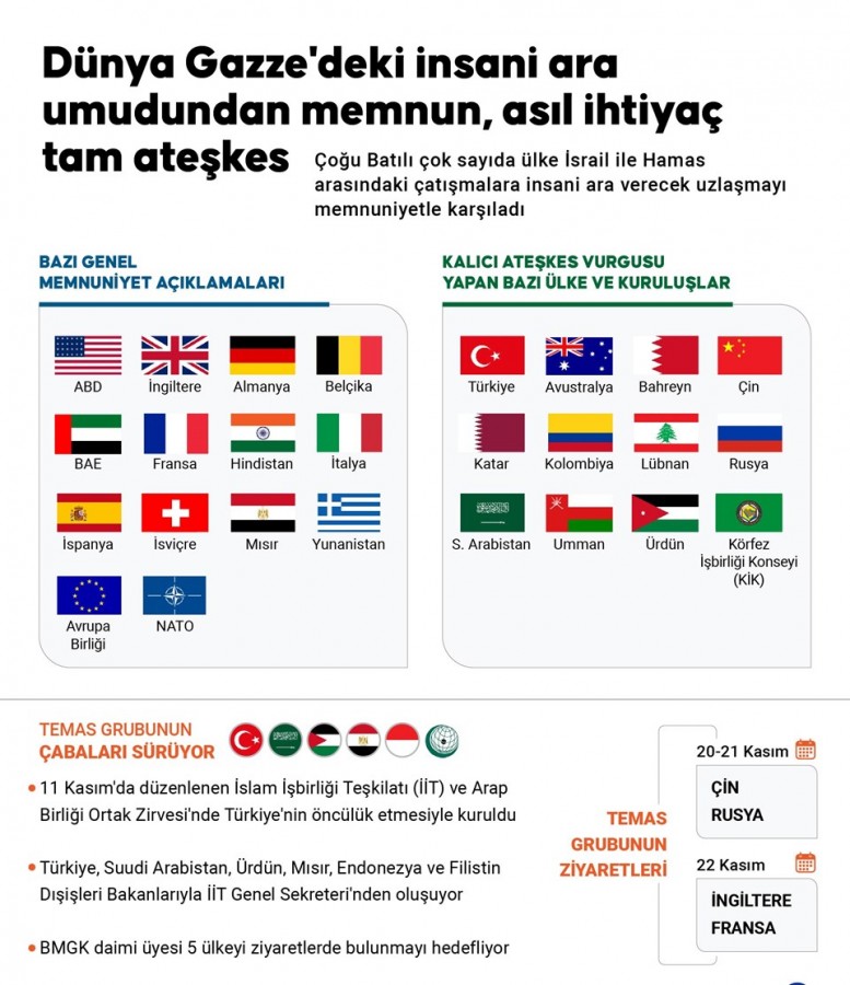 Ateşkes anlaşması kapsamında Hamas'ın serbest bırakacağı 13 kişilik sivillerin listesi ise İsrail'e ulaştırıldı. Bu kişiler ateşkesin uygulanmaya girmesinden saatler sonra serbest bırakılacak. Hamas'ın rehineleri serbest bırakmasının ardından İsrail'in de Filistinli mahkumları serbest bırakması bekleniyor.
