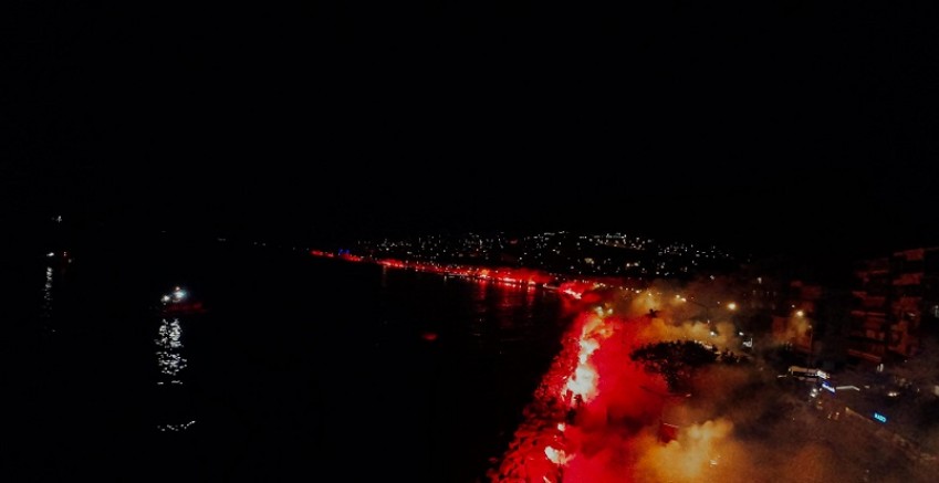 İlçenin sahil kısmının yaklaşık 3 kilometrelik bölümünde iki bine yakın vatandaş, bir römorkörden atılan işaret fişeğinin ardından ellerinde tuttukları meşaleleri ateşleyerek, sahilde eşsiz bir görüntü oluşturdular.
