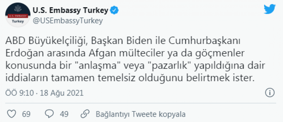 Büyükelçiliğin Twitter hesabından yapılan açıklamada, "ABD Büyükelçiliği, Başkan Biden ile Cumhurbaşkanı Erdoğan arasında Afgan mülteciler ya da göçmenler konusunda bir 'anlaşma' veya 'pazarlık' yapıldığına dair iddiaların tamamen temelsiz olduğunu belirtmek ister" denildi.