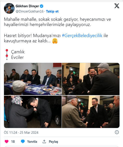 Cumhur İttifakı AK Parti Mudanya Belediye Başkan Adayı Gökhan Dinçer sosyal medya hesabında, "Mahalle mahalle, sokak sokak geziyor, heyecanımızı ve hayallerimizi hemşehrilerimizle paylaşıyoruz" dedi.