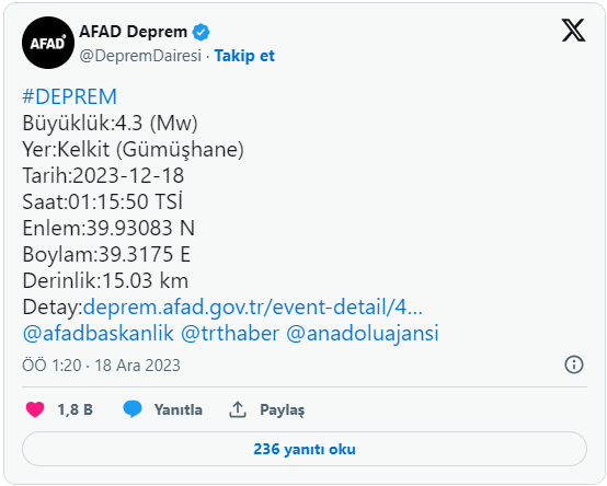 AFAD'ın açıkladığı bilgilere göre Gümüşhane'nin Kelkit ilçesinde saat 01.15'te 4,3 büyüklüğünde deprem meydana geldi. Depremin derinliği ise 15.03 kilometre olarak ölçüldü.