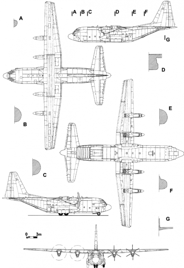 C-130B modeli yaklaşık 29,8 metre uzunluğunda, 40,4 metre kanat açıklığına ve 11,6 metre yüksekliğe sahip.