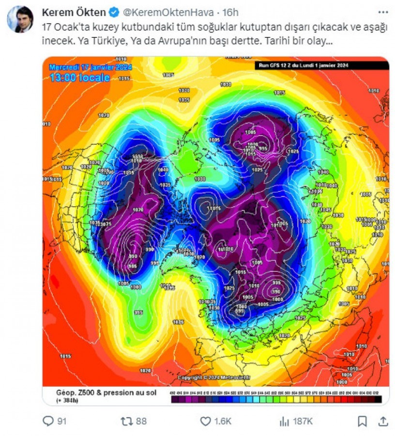 "17 Ocak'ta kuzey kutbundaki tüm soğuklar kutuptan dışarı çıkacak ve aşağı inecek. Ya Türkiye, Ya da Avrupa'nın başı dertte. Tarihi bir olay..."