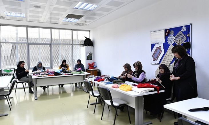 Soğanlı Kültür Merkezi’nde düzenlenen el sanatları kursuna katılan kadınlar, kış nedeniyle zor zamanlar yaşayan depremzedelere el emeği göz nuru atkı, bere, yelek, eldiven ve patik örerken, aynı zamanda ürünleri tek tek paketledi.