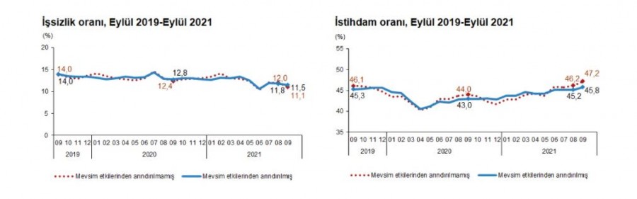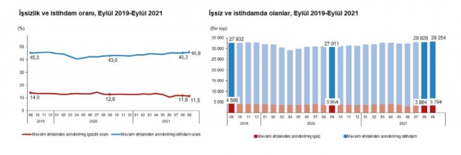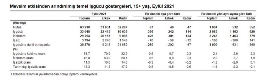 İstihdam edilenlerin sayısı eylülde bir önceki aya göre 426 bin kişi artarak 29 milyon 254 bin kişi, istihdam oranı ise 0,6 puanlık artış ile yüzde 45,8 oldu.İşgücü bir önceki aya göre 356 bin kişi artarak 33 milyon 48 bin kişi, işgücüne katılma oranı ise 0,5 puanlık artış ile yüzde 51,7 olarak gerçekleşti.