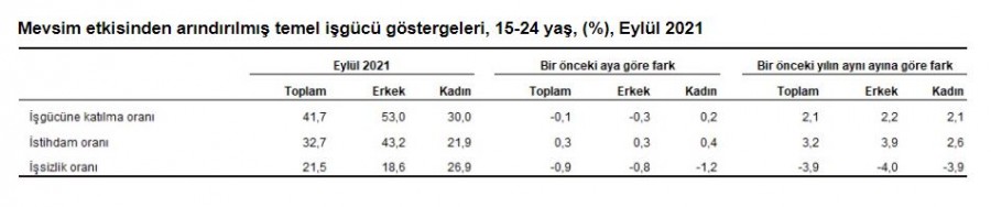 15-24 yaş grubunu kapsayan genç nüfusta işsizlik oranı bir önceki aya göre 0,9 puan azalarak yüzde 21,5, istihdam oranı 0,3 puanlık artışla yüzde 32,7 oldu.Bu yaş grubunda işgücüne katılma oranı ise bir önceki aya göre 0,1 puan azalarak yüzde 41,7 seviyesinde gerçekleşti.