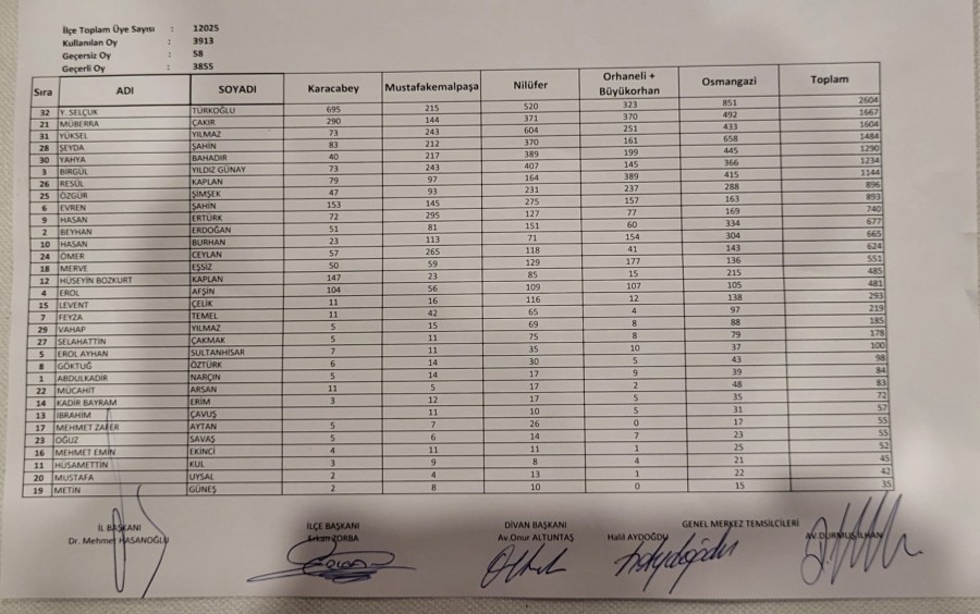 Bursa 1.Bölge kesin sonuçlarına göre Selçuk Türkoğlu toplam 2604 oy olarak liste başı seçildi.