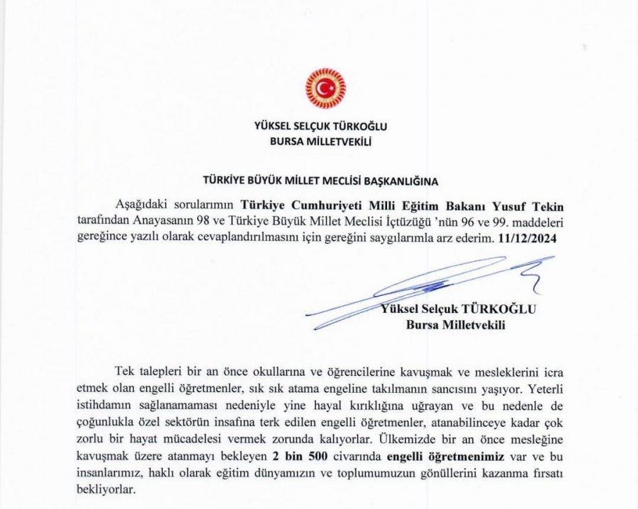 İYİ Parti Bursa Milletvekili Selçuk Türkoğlu'nun TBMM Başkanlığı'na sunduğu ilgili sor önergesi şöyle: