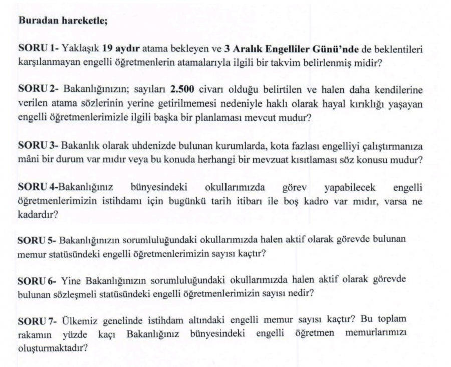 SORU 1- Yaklaşık 19 aydır atama bekleyen ve 3 Aralık Engelliler Günü'nde de beklentileri karşılanmayan engelli öğretmenlerin atamalarıyla ilgili bir takvim belirlenmiş midir?