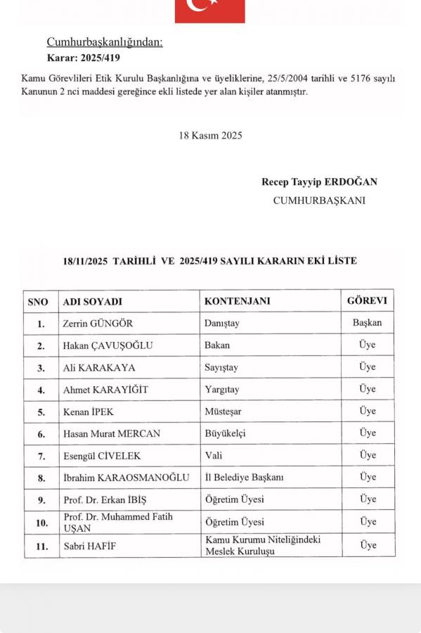Cumhurbaşkanı Recep Tayyip Erdoğan'ın imzasıyla Kamu Görevlileri Etik Kurulu başkanlık ve üyeliklerine yeni atamalar gerçekleşti.