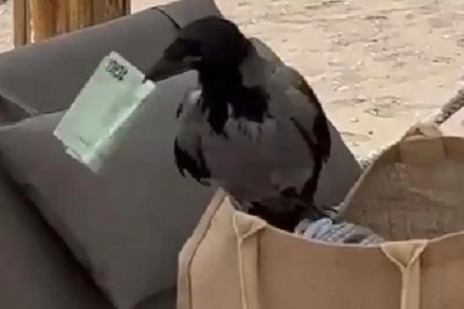 Serik ilçesi Belek turizm merkezinde yaşanan olayda, bir otelin sahilinde yüzmeye gelen turistlerin olduğu masaya konan karga, ağzı açık çantandan 100 euroyu gagasıyla aldı.