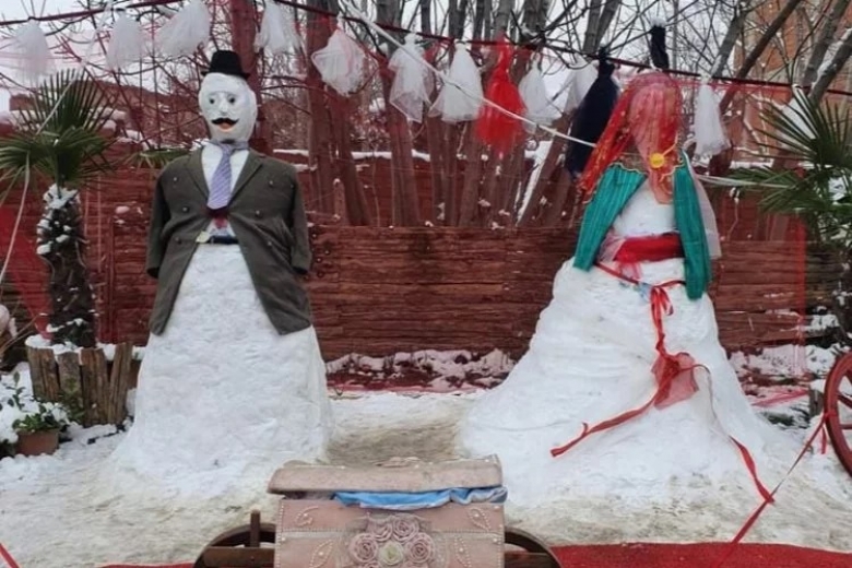 Bursa'da vatandaşlar el becerilerini konuşturup kardan gelin ile damat yapıp nişan düzenlediler. Bu fotoğraflar ise sosyal medyada büyük ilgi görüyor.