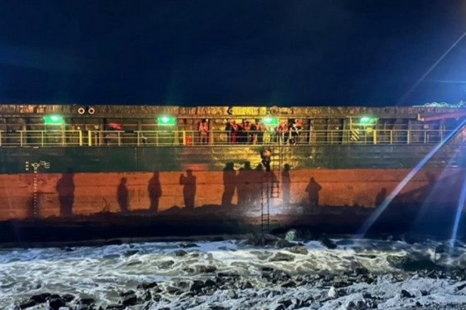 İnebolu ilçesinde fırtına nedeniyle Kamboçya bayraklı "Vamos" adlı kuru yük gemisi kıyıya sürüklendi.