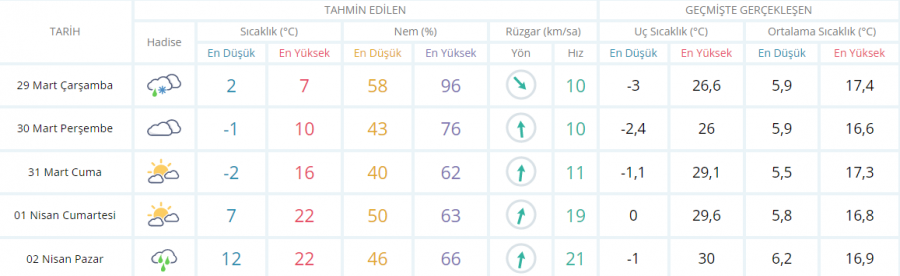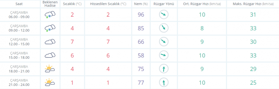 Çok bulutlu, karla karışık yağmur ve kar yağışlı geçeceği tahmin ediliyor. Yağışların bölge genelinde yer yer kuvvetli olması bekleniyor. Rüzgarın kuzey ve kuzeybatı yönlerden kuvvetli (50-70 km/saat) olarak eseceği tahmin ediliyor.