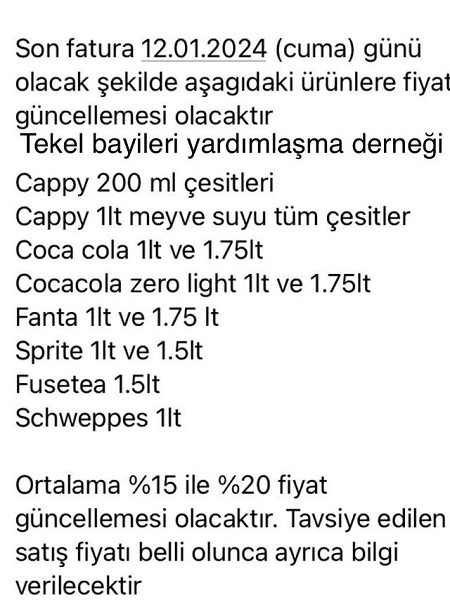 Tekel Bayileri Yardımlaşma Derneği (TBYD) Başkanı Erol Dündar, Coca Cola ve Fanta ürünlerine yüzde 15 ile 20 oranında zam geleceğini duyurdu.