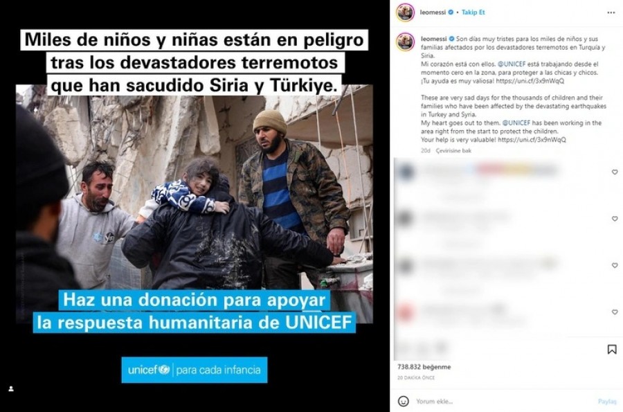 Messi, 429 milyon kişinin takip ettiği Instagram hesabından paylaştığı mesajında, "Türkiye ve Suriye'deki yıkıcı depremlerden etkilenen binlerce çocuk ve aileleri için oldukça üzücü günler... Kalbim onlarla birlikte." ifadelerini kullandı ve takipçilerini ilk günden bu yana deprem bölgesindeki çocukları korumak için çalışmalarını sürdüren UNICEF'e bağış yapmaya çağırdı.