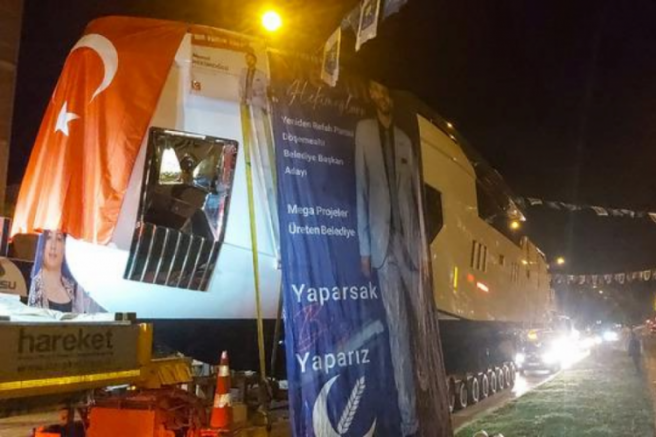 Seçim çalışmaları kapsamında düzenlenen konvoyun en önünde giden yatın yüklü olduğu kamyonun arkasında ise parti ve Hekimoğlu'nun fotoğraflarının olduğu seçim otobüsleri ve parti üyelerinin araçları yer aldı.