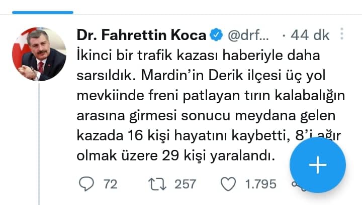 Sağlık Bakanı Fahrettin Koca sosyal medya hesabından yaptığı açıklama ile gerçekleşen feci kazada ölü sayısının 16'ya çıktığını belirtti.