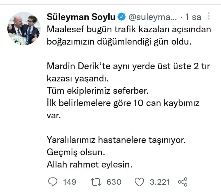 İçişleri Bakanı Süleyman Soylu sosyal medya hesabından yaptığı paylaşımda ölü sayısının arttığını açıkladı.