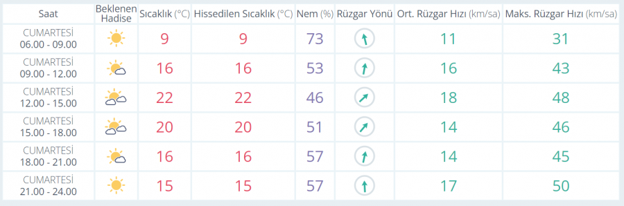 Hava Durumu: Parçalı ve çok bulutlu, hafif sağanak yağışlı; Rüzgar: Kuzey Ege’de güney ve güneybatıdan 5 ila 7, gece saatlerinden itibaren 6 ila 8; Güney Ege’de güney ve güneybatıdan, güneyi güneydoğudan 3 ila 5, gece saatlerinden itibaren geneli güneydoğudan 5 ila 7 kuvvetinde, Dalga: 2,0 ila 3,0 m; Görüş: İyi, yağış anında orta.