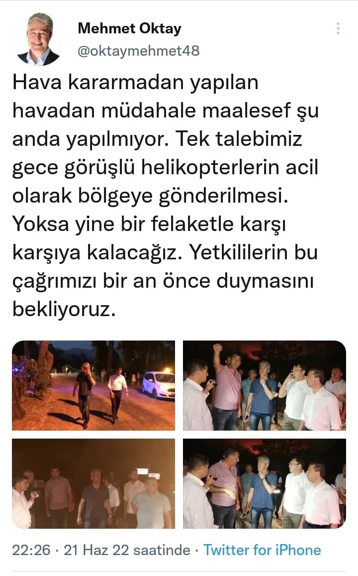 Hava kararmasıyla birlikte havadan müdahalenin yapılamadığını belirten Başkan Oktay, "Tek talebimiz gece görüşlü helikopterlerin acil olarak bölgeye gönderilmesi. Yoksa yine bir felaketle karşı karşıya kalacağız. Yetkililerin bu çağrımızı bir an önce duymasını bekliyoruz" dedi.