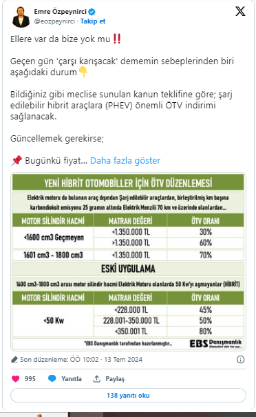 "Türkiye'de üretilen ilk şarj edilebilir hibrit model olan Toyota C-HR bu teşvikten yararlanamazken ve diğer yerli modeller için 2 yıldır matrah güncellemesi yapılmamışken, sadece ithal markaların teşvik edilmesi ilginç" diyerek ÖTV indiriminden yararlanacak modelleri listeledi...