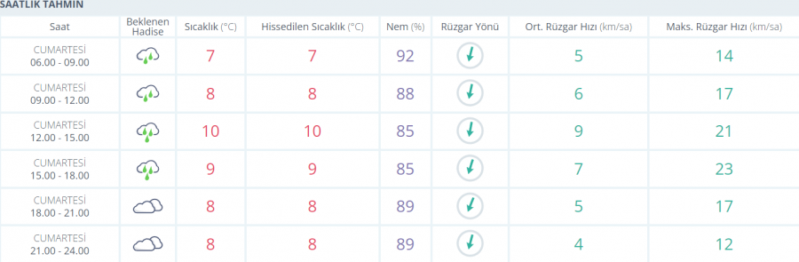 Meteoroloji Genel Müdürlüğü tarafından yapılan son değerlendirmelere göre: Ülkemiz genelinin parçalı ve çok bulutlu, Marmara'nın doğusu, Doğu Akdeniz, İç Anadolu'nun kuzeyi ve güneydoğusu, Karadeniz, Doğu ve Güneydoğu Anadolu'nun yağışlı geçeceği tahmin ediliyor. Yağışların genellikle yağmur ve sağanak; Karadeniz'in iç kesimlerinin yüksekleri ile Doğu Anadolu'nun doğusunun karla karışık yağmur ve kar şeklinde olması bekleniyor. Gece ve sabah saatlerinde iç ve doğu kesimlerde pus ve yer yer sis, doğu kesimlerde yer yer buzlanma ve don olayı bekleniyor. Doğu Karadeniz'in iç kesimleri ile Doğu Anadolu'nun kuzey ve doğusunda çığ tehlikesi bulunmaktadır.