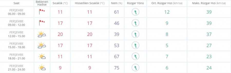 Hava Durumu: Parçalı ve az bulutlu, Rüzgar: Güney ve güneybatıdan 5 ila 7, sabah saatlerinde 8 kuvvetinde, Dalga: 2,5 ila 3,5 m, Görüş: Orta.