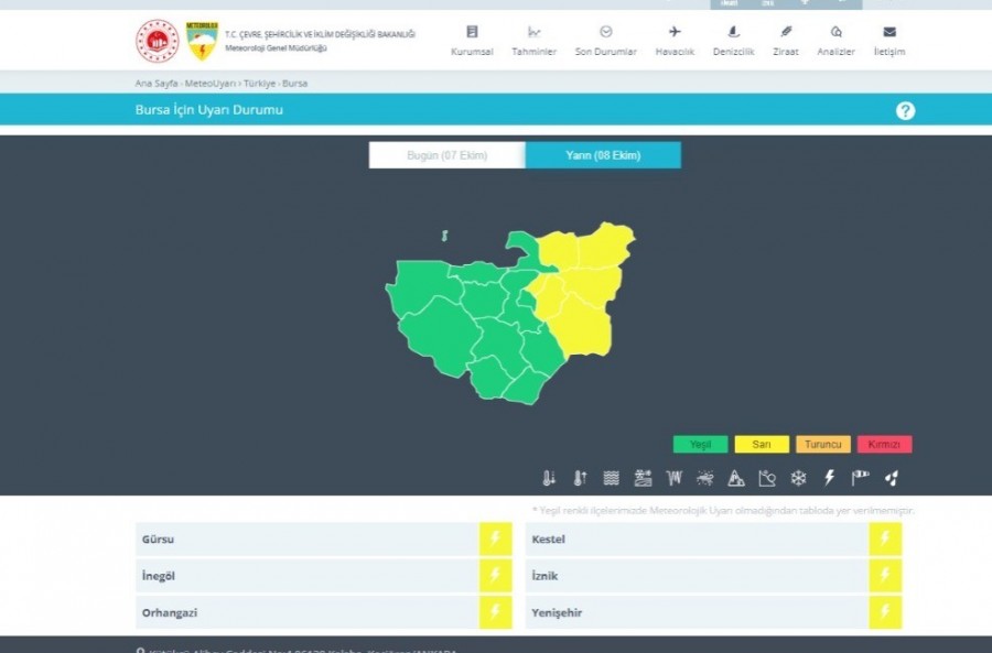 Bursa'nın 6 ilçesi, haritada sarı ile işaretlendi. Sarı renk, 'Hava durumu potansiyel tehlikelidir. Tahmin edilen meteorolojik hadise olağandışı olmamakla birlikte meteorolojik şartlardan etkilenebilecek faaliyetler konusunda dikkatli olunmalıdır' uyarılarını kapsıyor.
